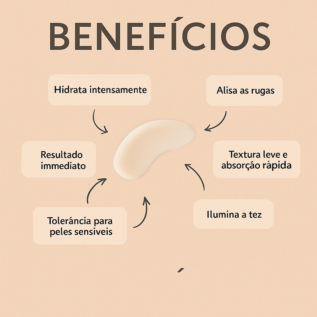 - Hidratação profunda, efeito de preenchimento imediato, reduz visivelmente as rídulas.